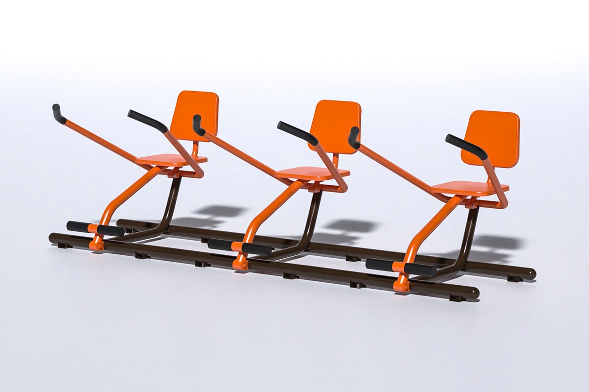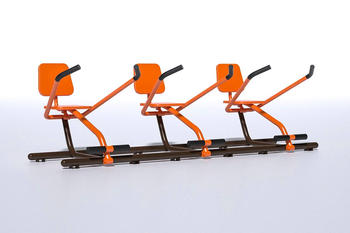 ACADEMIA AR LIVRE (AAL) OU ACADEMIA TERCEIRA IDADE (ATI) OU ACADEMIAS INOX (AIO aparelho SIMULADOR REMO TRIPLO é parte do conjunto de academia ar livre (AAL) e/ou academia terceira idade (ATI), fabricado pela Goloni Mobiliário Urbano, permite o fortalecimento de da cintura escapular (região composta por ombros, parte superior das costas e atrás do pescoço).